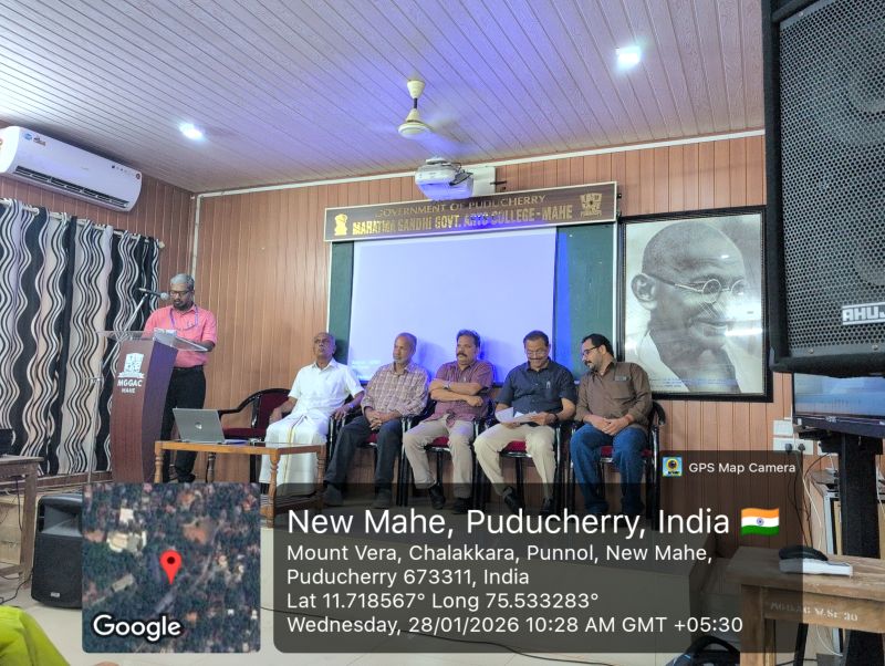 The Inaugural Session commenced at 10 am by an invocation. Mr. K. Kalamegam, Environmental Engineer welcomed the gathering and gave the introductory address. He explained the details of the programme. Regional Administrator Mr. D. Mohan Kumar presided over the function. During the presidential address he appreciated the Department of Science, Technology and Environment for introducing Climate Scholar Award. Mr. Ramesh Parambath, Member of Legislative Assembly, Mahe inaugurated the event. During his inaugural address he appealed the participants to make use of the opportunity and pursue research in the field of Climate Change and its impact. The Principal Dr. K.K. Sivadasan delivered the Keynote address. He gave a brief introduction on Climate Change and its Impact. Dr. K.M. Gopinathan, HoD Zoology and IQAC Coordinator felicitated the programme. Dr. G. Pradeep Kumar, HoD Botany and Programme Coordinator proposed the vote of thanks. There were Four Technical Sessions after the Inaugural Session. Mrs. Thenmozhi, Senior Project Associate, Puducherry Climate Change Cell, DSTE delivered a talk on Introduction to Climate Science, Climate Scenarios & Recent Development in Climate Change. During the second technical session Mrs. Santhalakshmy, Senior Project Associate, Puducherry Climate Change Cell, DSTE delivered a talk on Carbon Foot -printing: Methodologies for Climate Accounting – individual, organizational, or sectoral carbon footprints, Global Emission scenarios, emissions, reductions and targets. During the third session Mr. Balaji, Senior Project Associate, Puducherry Climate Change Cell, DSTE delivered a talk on Introduction to Meteorology and Meteorological data collection in the Indian context. Mr. Pannerselvam, Senior Project Associate, Puducherry Climate Change Cell, DSTE engaged the technical session Four. It was pertaining to Climate Data Analysis and hands on training (Methodology, Questionnaire and Report). Each technical session was followed by interaction and doubt clearing. The concluding session was the announcement of Climate Scholar Award. Mr. Pannerselvam explained the details and asked the participants to register on or before the 4th of February 2026. Selected teams have to submit the report of the research work latest by 28th of February and the first three teams will be selected for the award. Each team (2 persons) will be awarded certificates and rupees ten thousand. The Programme coordinator proposed the vote of thanks. The event concluded at 4.30 pm with the National Anthem.